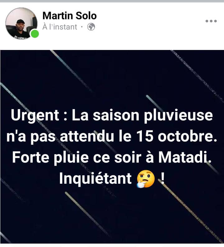 On s’y attendait le moins, et peut être pas. Vendredi soir une pluie battante a surpris la quasi-totalité de la province du kongo central. De Madimba à tshela, madame la pluie a surpris tout son monde. Stress par là, cris de joies par ici, c’est Ainsi que la population du Kongo Central, mitigée a accueilli le retour de la saison pluvieuse.