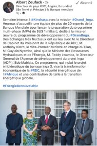« Ce programme, qui inclut le projet emblématique du barrage Inga III, vise à transformer l’économie de la RDC, à assurer la sécurité énergétique de l’Afrique et à contribuer de manière significative à la transition énergétique mondiale », a déclaré Monsieur Albert Zeufack sur son compte LinkedIn.