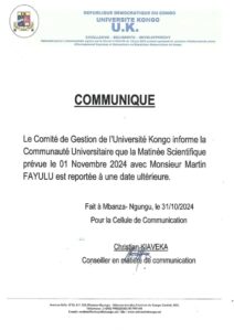 Le Comité de Gestion de l’Université Kongo a annoncé ce jeudi 31 octobre , à travers un communiqué officiel, le report de la Matinée Scientifique prévue initialement le 1er novembre 2024. Cet événement, qui devait accueillir comme invité spécial M. Martin Fayulu, leader politique et figure influente, est repoussé à une date ultérieure.